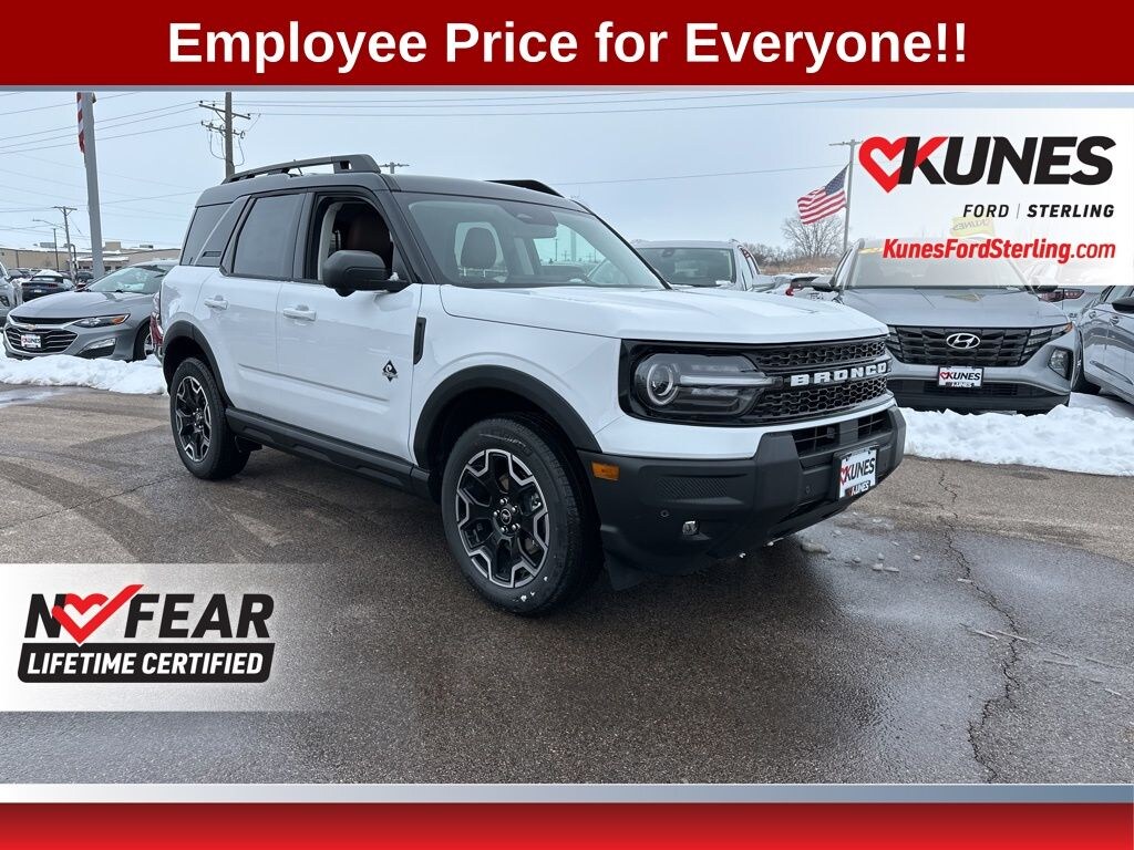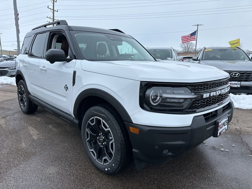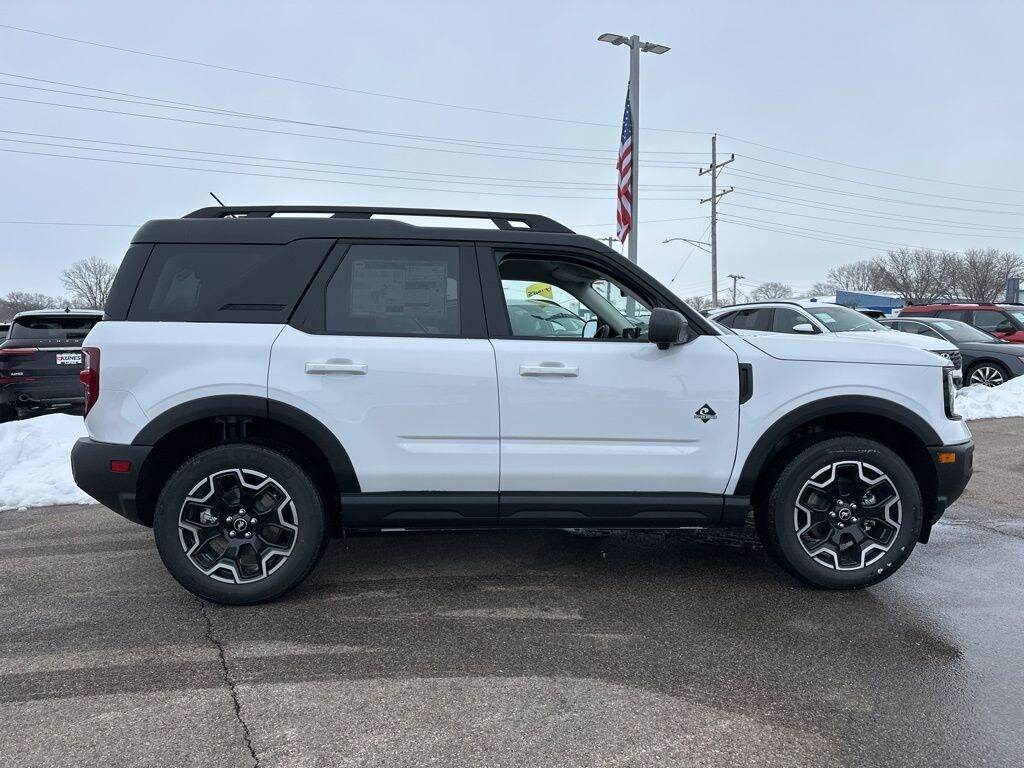 Oxford White 2025 Ford Bronco Sport Outer Banks 360-Degree Camera w/Trail & Split View, 4-Wheel Disc Brakes, 6 Speakers, ABS brakes, Air Conditioning, Alloy wheels, AM/FM radio: SiriusXM, AM/FM Stereo, Auto High-beam Headlights, Auto-dimming Rear-View mirror, Automatic temperature control, B&O Sound System by Bang & Olufsen, Brake assist, Compass, Connected Navigation, Delay-off headlights, Driver door bin, Driver vanity mirror, Dual front impact airbags, Dual front side impact airbags, Electronic Stability Control, Emergency communication system: SYNC 4 911 Assist, Equipment Group 300A, Four wheel independent suspension, Front anti-roll bar, Front Bucket Seats, Front Center Armrest, Front Driver/Passenger Seat Back Map Pockets, Front dual zone A/C, Front fog lights, Front License Plate Bracket, Front Parking Sensors, Front reading lights, Fully automatic headlights, Garage door transmitter, HD Radio, Heated door mirrors, Heated front seats, Heated steering wheel, Illuminated entry, Knee airbag, Low tire pressure warning, Memory seat, Occupant sensing airbag, Outer Banks Tech Package+, Outside temperature display, Overhead airbag, Overhead console, Panic alarm, Passenger door bin, Passenger vanity mirror, Power door mirrors, Power driver seat, Power passenger seat, Power steering, Power windows, Premium Trimmed Front Bucket Seats w/Ebony/Roast, Radio data system, Rain sensing wipers, Rear anti-roll bar, Rear Parking Sensors, Rear reading lights, Rear seat center armrest, Rear window defroster, Rear window wiper, Remote keyless entry, Reverse Brake Assist, Security system, SiriusXM, Speed control, Speed-sensing steering, Speed-Sensitive Wipers, Split folding rear seat, Steering wheel mounted audio controls, SYNC 4 w/Enhanced Voice Recognition, Tachometer, Telescoping steering wheel, Tilt steering wheel, Traction control, Trip computer, Variably intermittent wipers, Wheels: 18" Ebony Black-Painted Aluminum. 25/30 City/Highway MPG