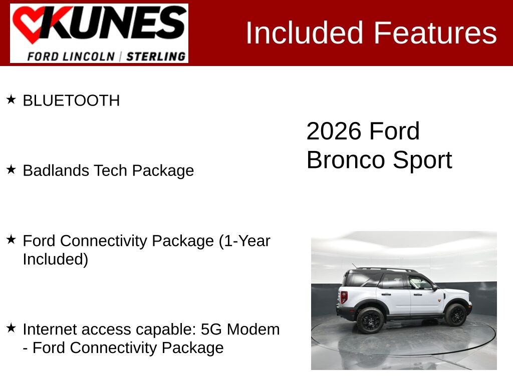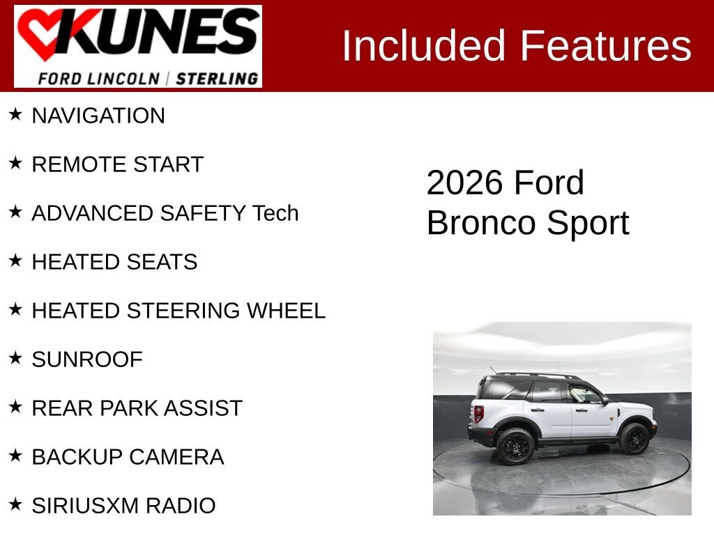 The 2026 Bronco Sport is a fun to drive car that achieves a fantastic 27 MPG! Also included with every new vehicle: LIFETIME "NO FEAR" WARRANTY and AT HOME COURTESY DELIVERY! Call us for full details! We pride ourselves on honesty and integrity, but please note that mistakes or misprints due to human error are possible. Find out why our dealerships have won DealerRater.com DEALER OF THE YEAR a whopping 10 TIMES! Call, email, or live chat with one of our friendly sales professionals now to schedule your test drive! Prices shown do not include taxes, license, and title fees and a $377.63 documentary service fee, and $399 Security Fee. Price includes: Price Includes: $2000 - Trade in assistance. Exp. 12/31/2026 Trade In Allowance. Trade must be 2020 or newer and have less than 65k miles