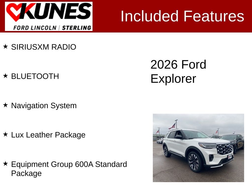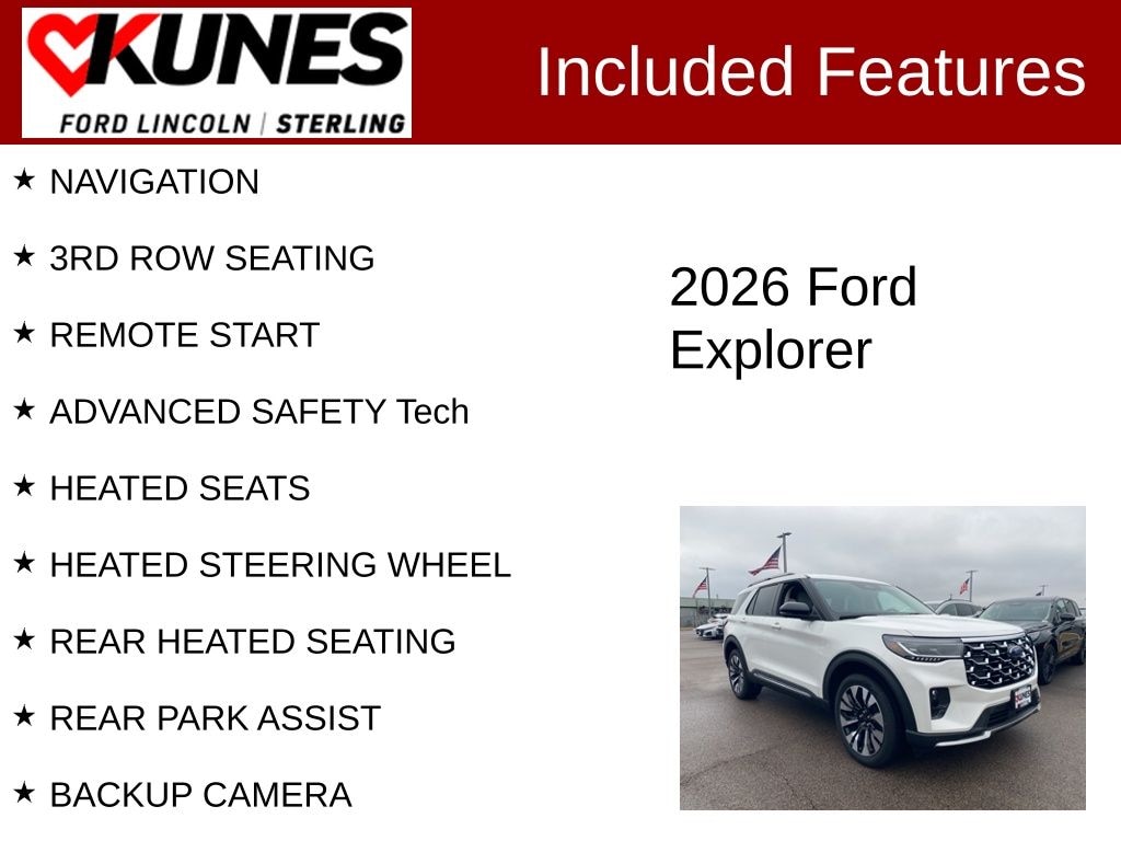 The 2026 Explorer can carry all the passengers and cargo you need in style and comfort. Also included with every new vehicle: LIFETIME "NO FEAR" WARRANTY and AT HOME COURTESY DELIVERY! Call us for full details! We pride ourselves on honesty and integrity, but please note that mistakes or misprints due to human error are possible. Find out why our dealerships have won DealerRater.com DEALER OF THE YEAR a whopping 10 TIMES! Call, email, or live chat with one of our friendly sales professionals now to schedule your test drive! Prices shown do not include taxes, license, and title fees and $367.70 documentary service fee, and $399 Security Fee. Price includes: $1000 - Retail Customer Cash. Exp. 01/05/2026 $500 - Bonus Customer Cash. Exp. 01/05/2026