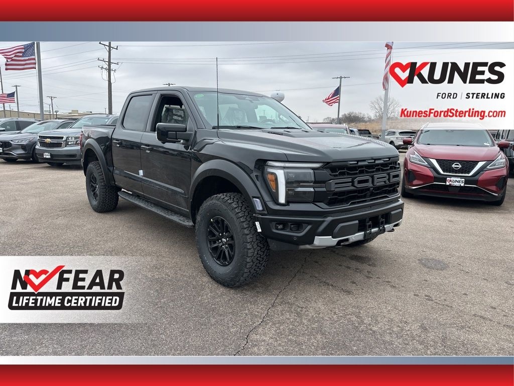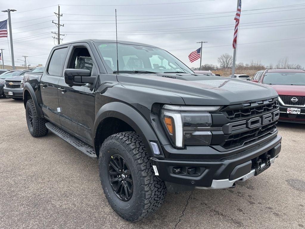 Agate Black Metallic 2026 Ford F-150 Raptor NAVIGATION, ADAPTIVE CRUISE, REMOTE START, ADVANCED SAFETY Tech, HEATED STEERING WHEEL, HEATED/COOLED SEATS, REAR HEATED SEATING, PANORAMIC SUNROOF, REAR PARK ASSIST, BACKUP CAMERA, SIRIUSXM RADIO, BLUETOOTH, F-150 Raptor, 4D SuperCrew, 3.5L V6 EcoBoost High Output, 10-Speed Automatic, 4WD, Agate Black Metallic, Black Leather, Equipment Group 801A Standard, Ford Connectivity Package (1-Year Included), Internet access capable: 5G Modem - Ford Connectivity Package, Navigation system: Connected Navigation, 14 Speakers, 17" Cast Aluminum Wheels, 4-Wheel Disc Brakes, ABS brakes, Adjustable pedals, Air Conditioning, Alloy wheels, AM/FM radio: SiriusXM with 360L, Auto High-beam Headlights, Auto tilt-away steering wheel, Auto-dimming door mirrors, Auto-dimming Rear-View mirror, Automatic temperature control, Brake assist, Bumpers: body-color, Compass, Delay-off headlights, Driver door bin, Driver vanity mirror, Driver's Side SecuriCode Keyless-Entry Keypad, Dual front impact airbags, Dual front side impact airbags, Electronic Locking with 4.10 Axle Ratio, Electronic Stability Control, Emergency communication system: SYNC 4 911 Assist, Front anti-roll bar, Front Bucket Seats, Front Center Armrest, Front dual zone A/C, Front fog lights, Front License Plate Bracket, Front reading lights, Front wheel independent suspension, Fully automatic headlights, Garage door transmitter, Heated door mirrors, Heated front seats, Heated rear seats, Heated steering wheel, Illuminated entry, Lane Departure Warning System, Leather steering wheel, Leather Trimmed Seats, Low tire pressure warning, Memory seat, Occupant sensing airbag, Outside temperature display, Overhead airbag, Overhead console, Panic alarm, Passenger door bin, Passenger vanity mirror, Pedal memory, Power door mirrors, Power driver seat, Power passenger seat, Power steering, Power windows, Radio data system, Radio: B&O Unleashed Sound System by Bang & Olufsen, Rain sensing wipers, Rear reading lights, Rear step bumper, Rear window defroster, Remote keyless entry, Security system, Speed control, Speed-sensing steering, Split folding rear seat, Steering wheel memory, Steering wheel mounted audio controls, SYNC 4 with Enhanced Voice Recognition, Tachometer, Telescoping steering wheel, Tilt steering wheel, Traction control, Trip computer, Turn signal indicator mirrors, Twin Panel Moonroof, Variably intermittent wipers, Ventilated front seats, F-150 Raptor, 4D SuperCrew, 3.5L V6 EcoBoost High Output, 10-Speed Automatic, 4WD, Agate Black Metallic, Black Leather, Equipment Group 801A Standard, Ford Connectivity Package (1-Year Included), Internet access capable: 5G Modem - Ford Connectivity Package, Navigation system: Connected Navigation.