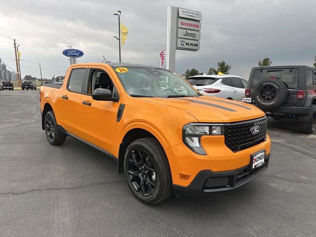 Apple CarPlay/Android Auto, Bluetooth, Rear View Camera, Rear Park Assist, Heated Seats, Keyless Entry, Keyless Ignition, Remote Start, Sirius/XM, Bed Liner, Tow Package, Steering Wheel Controls, Maverick XLT, 4D Crew Cab, EcoBoost 2.0L I4 GTDi DOHC Turbocharged VCT, 8-Speed Automatic, AWD, Orange Fury Metallic Tri-Coat, Black Onyx Cloth, 4K Tow Package, Black Appearance Package, Equipment Group 302A, Ford Co-Pilot360, Ford Connectivity Package (1-Year Included), Internet access capable: 5G Modem - Ford Connectivity Package, XLT Luxury Package, 2.91 Axle Ratio, 4-Wheel Disc Brakes, 6 Speakers, ABS brakes, Air Conditioning, Alloy wheels, AM/FM radio: SiriusXM with 360L, Apple CarPlay/Android Auto, Auto High Beams, Auto High-beam Headlights, Automatic temperature control, Black Grille, Black Interior Accents, Black Painted Mirrors, BLIS with Cross-Traffic Alert and Trailer Coverage, Brake assist, Bumpers: body-color, Compass, Delay-off headlights, Driver door bin, Driver vanity mirror, Dual front impact airbags, Dual front side impact airbags, Electronic Stability Control, Emergency communication system: SYNC 4 911 Assist, Exit Warning, Exterior Parking Camera Rear, Four wheel independent suspension, Front and Rear Molded Splash Guards (4-Piece), Front anti-roll bar, Front Bucket Seats, Front Center Armrest, Front reading lights, Fully automatic headlights, Heated Mirror with Painted Black Skull Caps, Heated Seats, Illuminated entry, Intersection Assist, Knee airbag, Lane-Keeping System, LED Box Lighting, Low tire pressure warning, Occupant sensing airbag, Outside temperature display, Overhead airbag, Overhead console, Panic alarm, Passenger door bin, Passenger vanity mirror, Power door mirrors, Power Glass Manual-Folding Mirrors, Power steering, Power windows, Pre-Collision Assist with Automatic Emergency Braking, Pro Power Onboard - 400W, Radio data system, Radio: AM/FM Stereo with 6 Speakers, Rear anti-roll bar, Rear Cross Traffic Braking, Rear Parking Sensors, Rear seat center armrest, Rear step bumper, Rear-View Camera, Remote keyless entry, Remote Start System, Security system, SiriusXM with 360L, Soft Vinyl Wrapped Heated Steering Wheel, Speed control, Speed-sensing steering, Steering wheel mounted audio controls, SYNC 4 with Enhanced Voice Recognition, Telescoping steering wheel, Tilt steering wheel, Tough Bed Spray-in Bedliner, Traction control, Trailer Brake Controller, Trailer Hitch (class III) 2" Receiver, Trip computer, Unique Cloth Front Bucket Seats, Unique Cloth Front Bucket Seats with Black Appearance, Upgraded Cooling Fan, Wheels: 17" Carbonized Gray Painted Aluminum, Wheels: 19" Black Painted Aluminum, Maverick XLT, 4D Crew Cab, EcoBoost 2.0L I4 GTDi DOHC Turbocharged VCT, 8-Speed Automatic, AWD, Orange Fury Metallic Tri-Coat, Black Onyx Cloth, 4K Tow Package, Black Appearance Package, Equipment Group 302A, Ford Co-Pilot360, Ford Connectivity Package (1-Year Included), Internet access capable: 5G Modem - Ford Connectivity Package, XLT Luxury Package. 2026 Ford Maverick XLT Orange Fury Metallic Tri-Coat EcoBoost 2.0L I4 GTDi DOHC Turbocharged VCT 22/30 City/Highway MPG