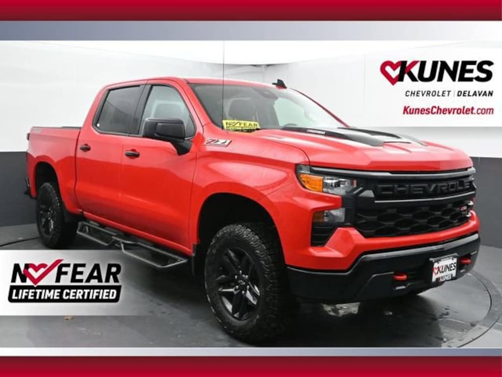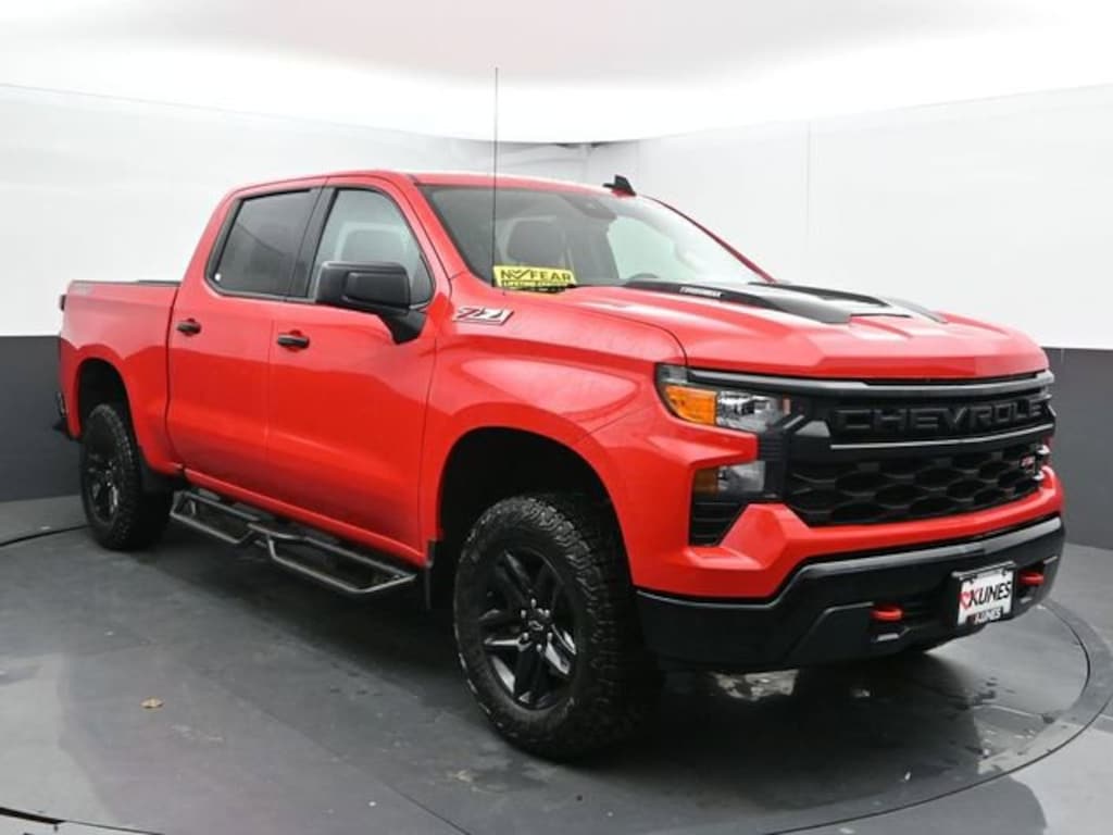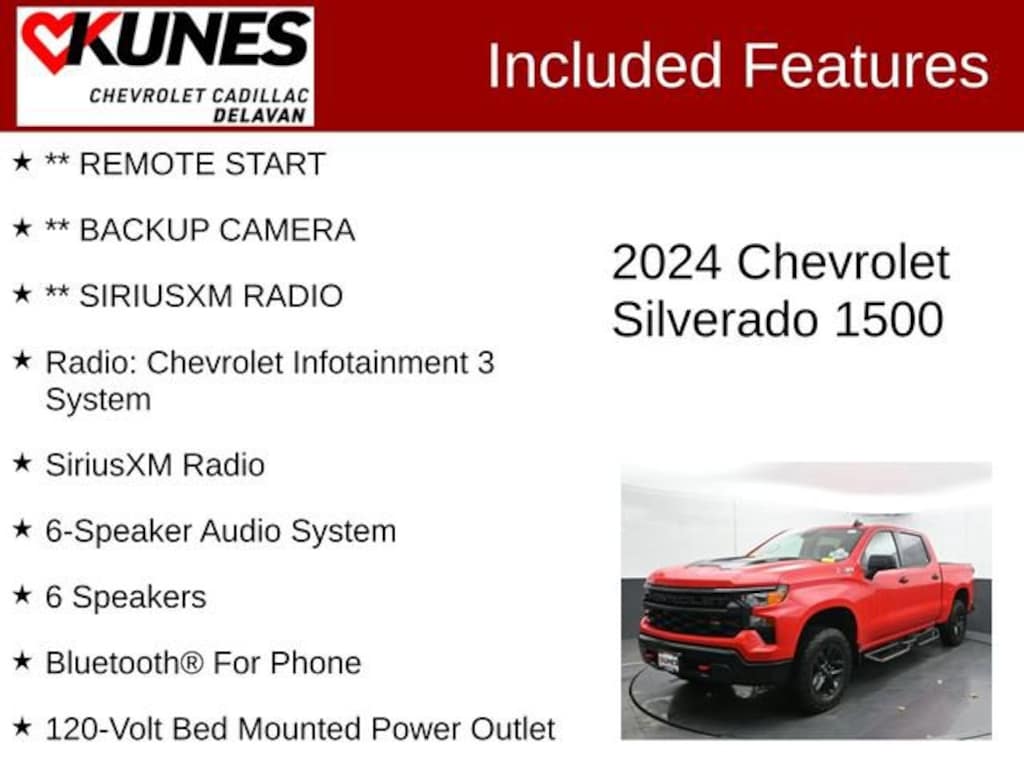 2024 Chevrolet Silverado 1500 Custom Trail Boss Red Hot 4WD 2.7L I4 Turbocharged DOHC 16V LEV3-SULEV30 310hpRecent Arrival! Clean CARFAX. CARFAX One Owner. Bed liner for added cargo protection Integrated tailgate step for easier bed access Rear seat with storage and pass-through for flexible seating and cargo solutions Custom Convenience Package: rear defrost, remote engine start, and enhanced security system Trailer package with factory tow hitch Z71 Off-Road package with 2-inch suspension lift Front and rear off-road tires with all-season capability Heated side mirrors for better visibility Aluminum wheels for durability Privacy glass on rear windows Cloth split bench seats Driver adjustable lumbar support with power driver seat Power windows, power door locks, keyless entry, and keyless start WiFi hotspot and satellite radio capability Cruise control and adjustable steering wheel Rear backup camera for safer reversing Lane departure warning, lane keeping assist, and front collision mitigation Automatic highbeams and daytime running lights Full airbag system with front, side, and rear head airbags Stability control and traction control Tire pressure monitoring system 2.7L I-4 turbocharged engine and 8-speed automatic transmission Four-wheel drive with locking/limited slip differential