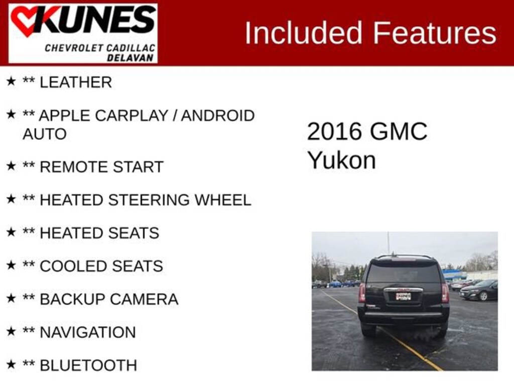 2016 GMC Yukon Denali Onyx Black 4WD EcoTec3 6.2L V8Recent Arrival! Clean CARFAX. Adaptive cruise control, collision mitigation, and lane keep assist Navigation system with smart device integration Heated and ventilated front seats, heated rear seats Blind spot monitor and cross-traffic alert Interior protection package with all-weather floor mats Magnetic Ride Control active suspension system Luggage rack Tow hitch and integrated trailer brake controller Running boards Heads-up display Heated, power-folding mirrors with turn signals Power tilt/telescoping steering wheel 3rd row seating and pass-through rear seat Memory settings for driver seat, mirrors, and pedals HD radio, Bluetooth, and premium audio capability Backup camera and rear parking aid Hands-free power liftgate and remote start Rear automatic highbeams Aluminum wheels and performance tires Universal garage door opener Molded splash guards and polished exhaust tips