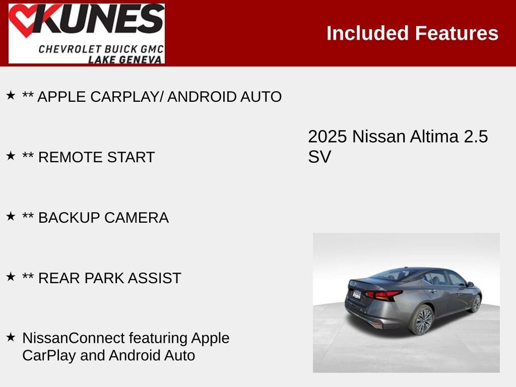 2025 Nissan Altima 2.5 SV 2.5L 4-Cylinder DOHC 16V CVT with Xtronic FWD 27/39 City/Highway MPG