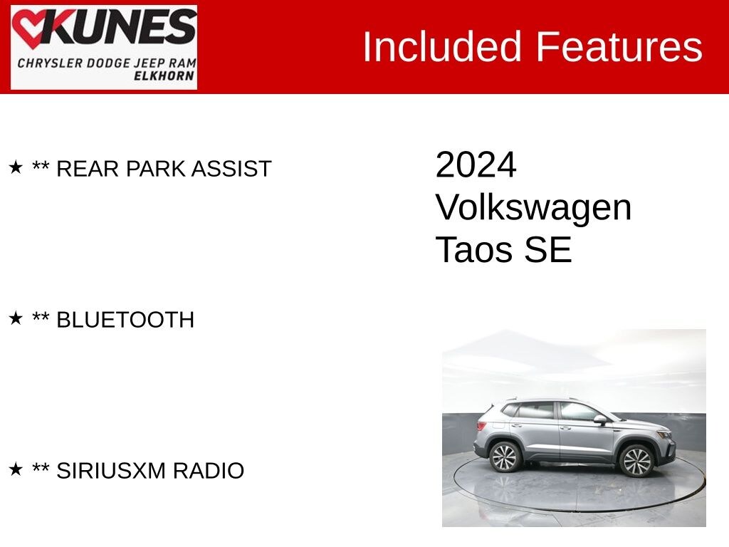 2024 Volkswagen Taos 1.5T SE 1.5L I4 Turbocharged DOHC 16V LEV3-SULEV30 158hp 8-Speed Automatic with Tiptronic FWD Clean CARFAX. 28/36 City/Highway MPG